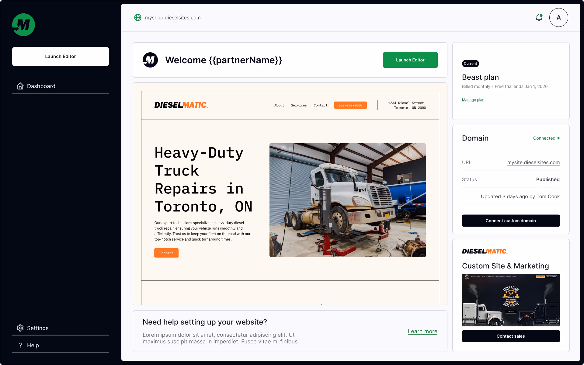 In collaboration with an agile product team, created a website builder platform for truck repair shops, enabling them to design and launch their own sites. Responsible for UX research, UI design in Figma, and front-end development in React.